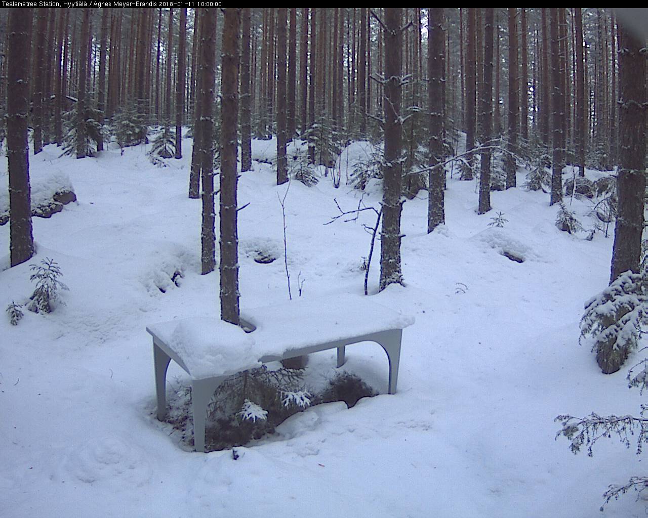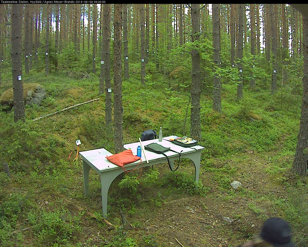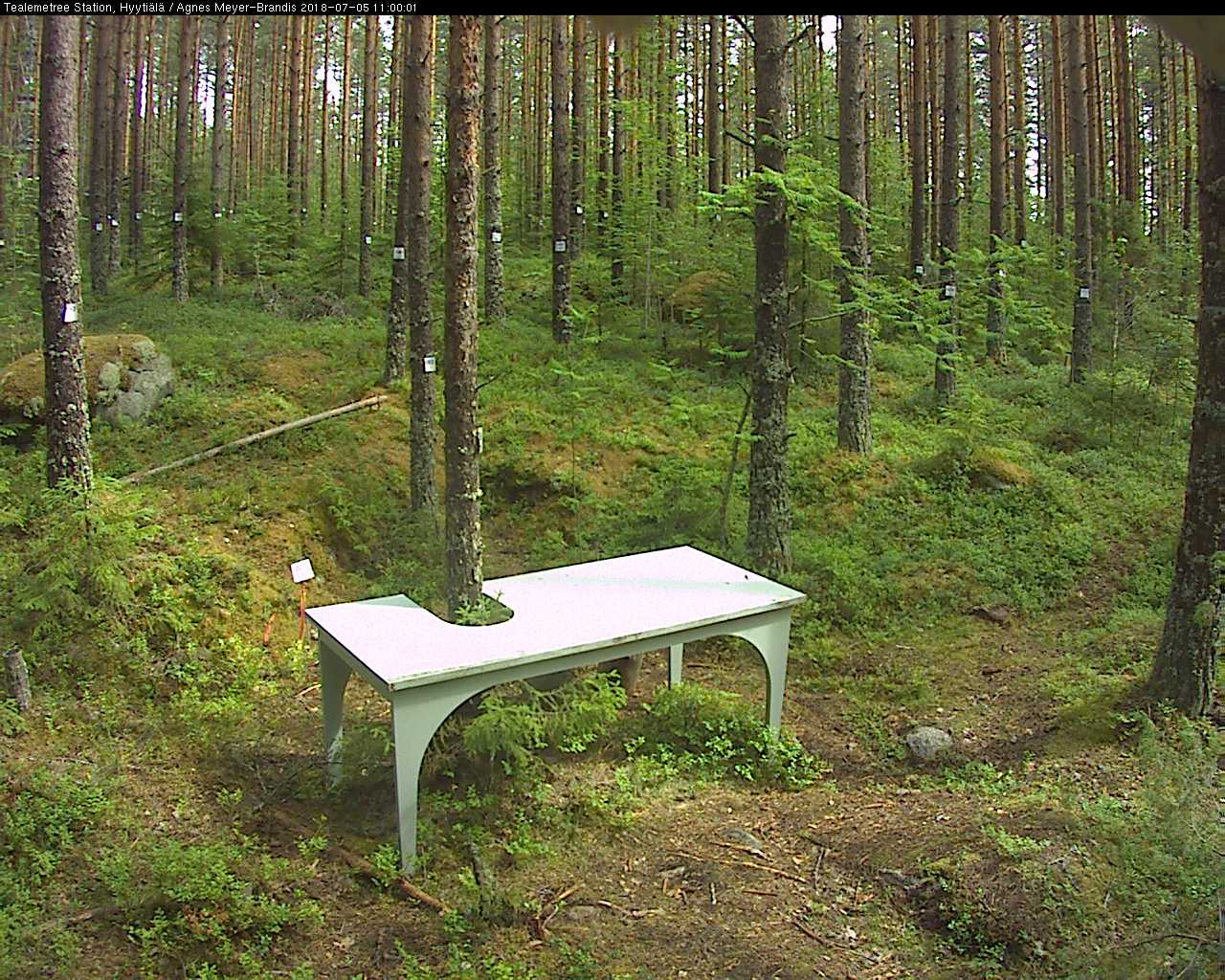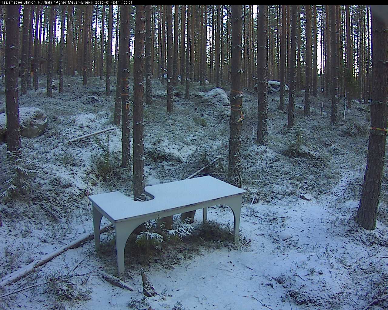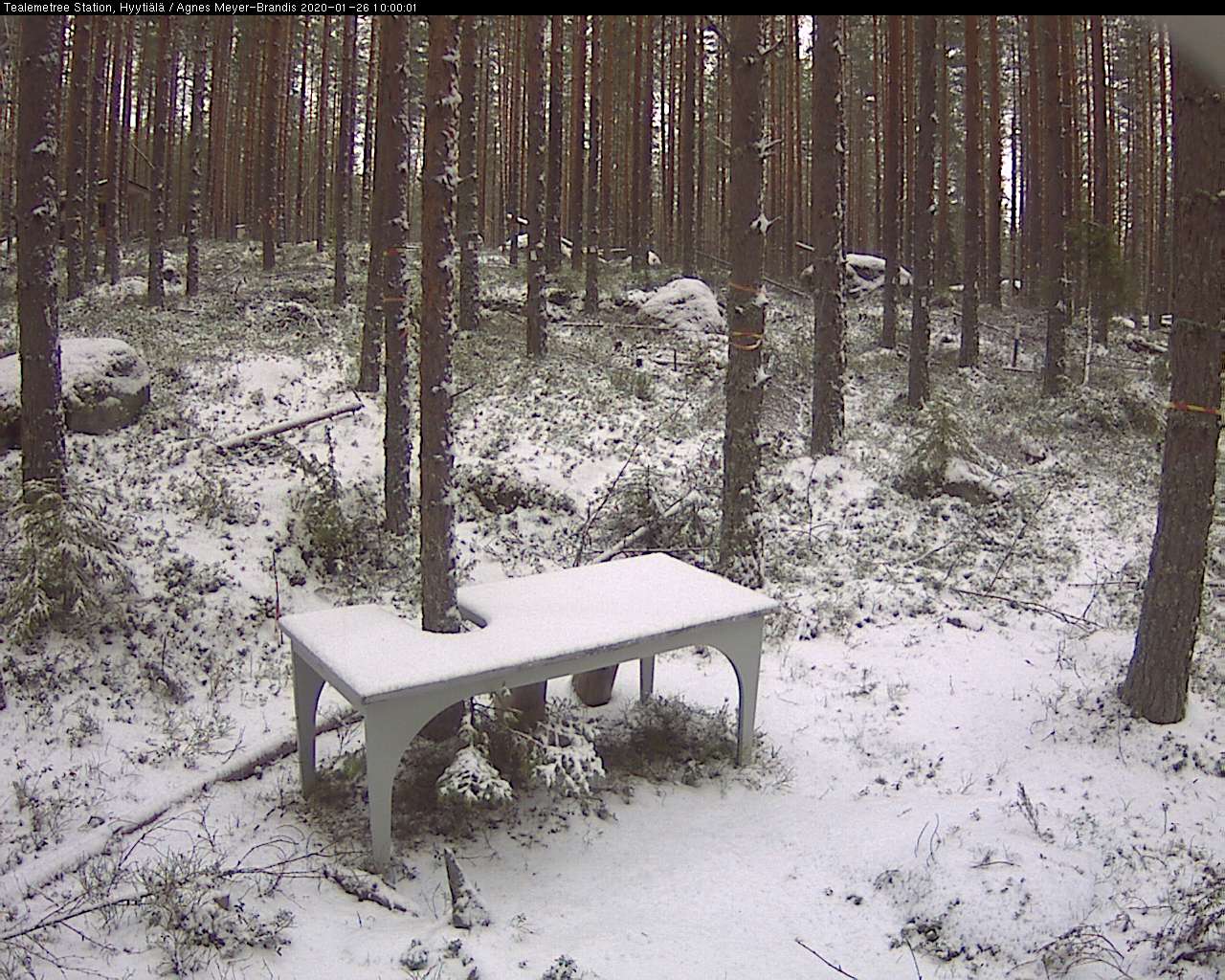 Agnes Meyer-Brandiksen työ Hyytiälässä alkoi tutustumalla aseman muihin tutkijoihin. Pystyäkseen tapaamaan ihmisiä metsässä, hän rakensi pöydän, josta muodostui kohtauspiste ja paikka teehetkille Agneksen ja puun kanssa.