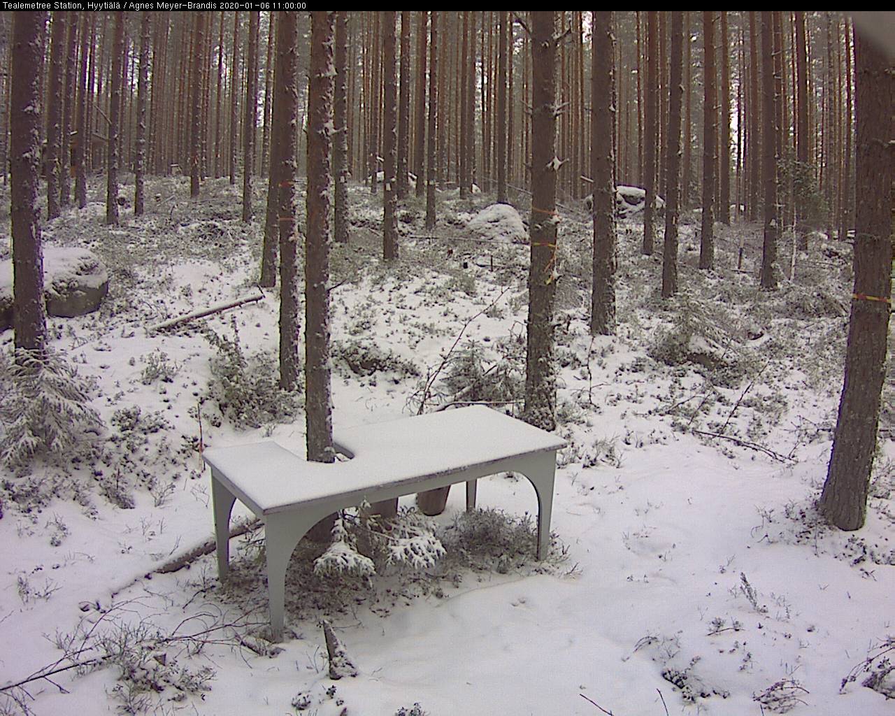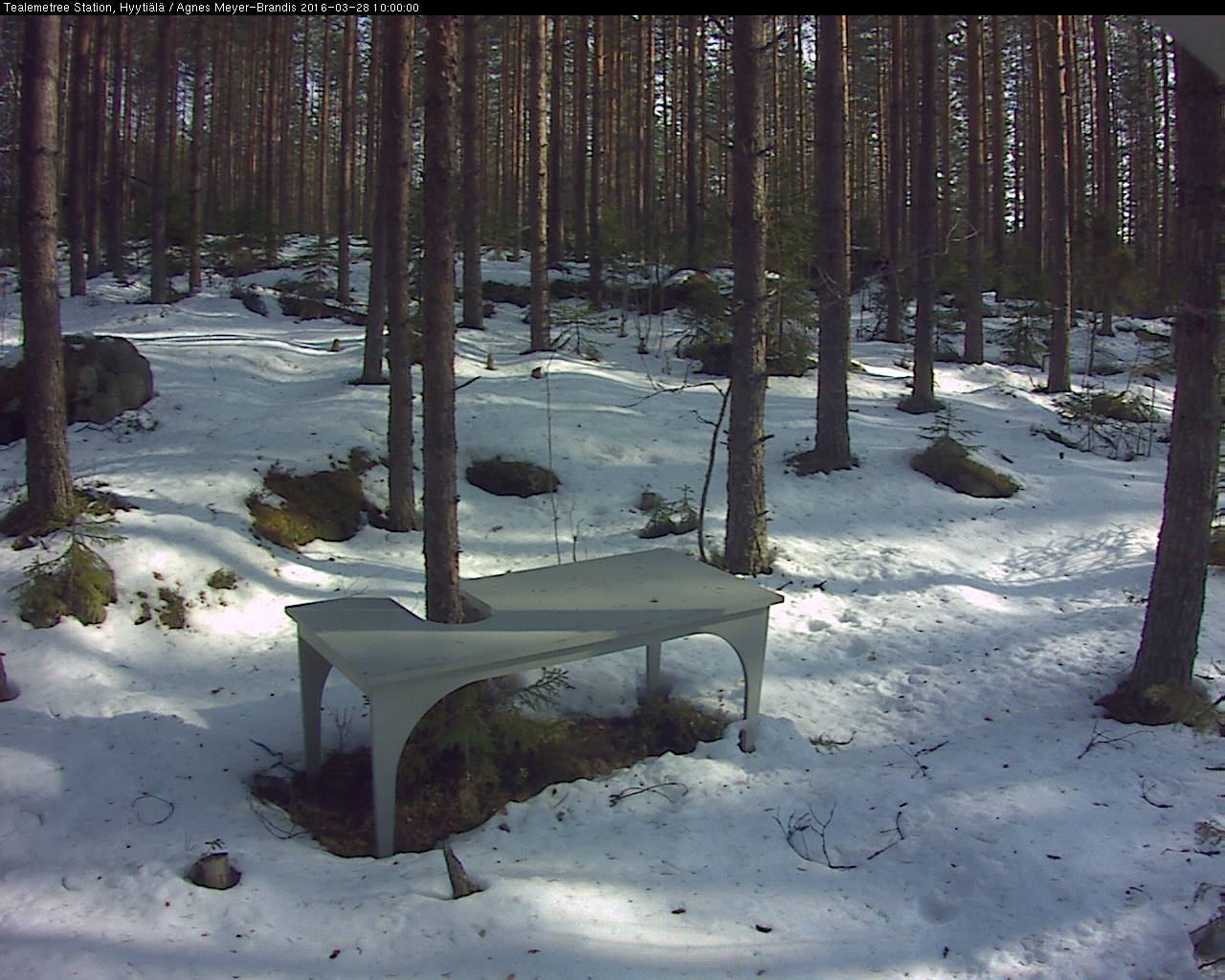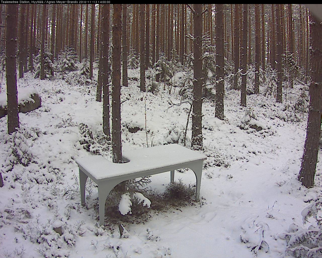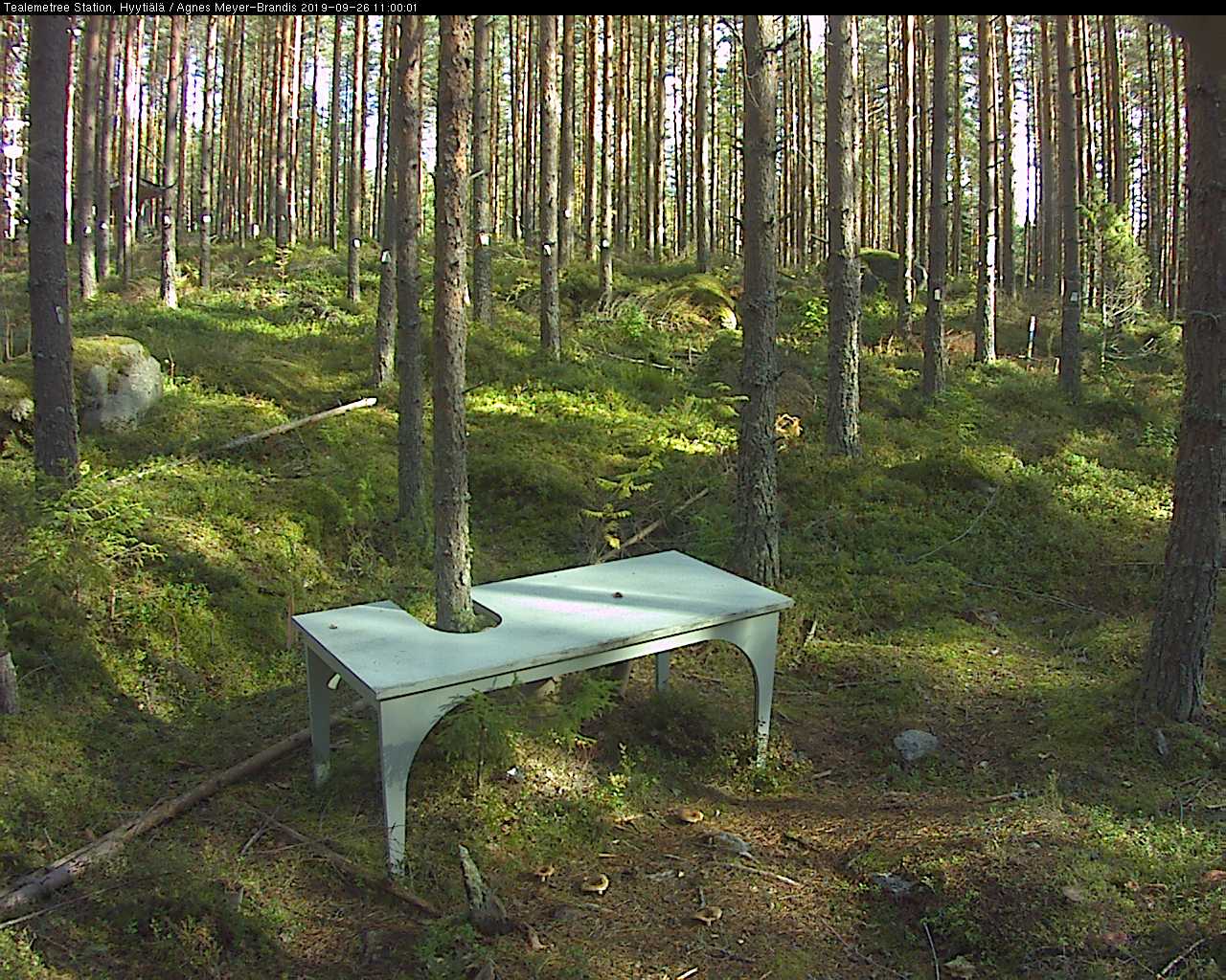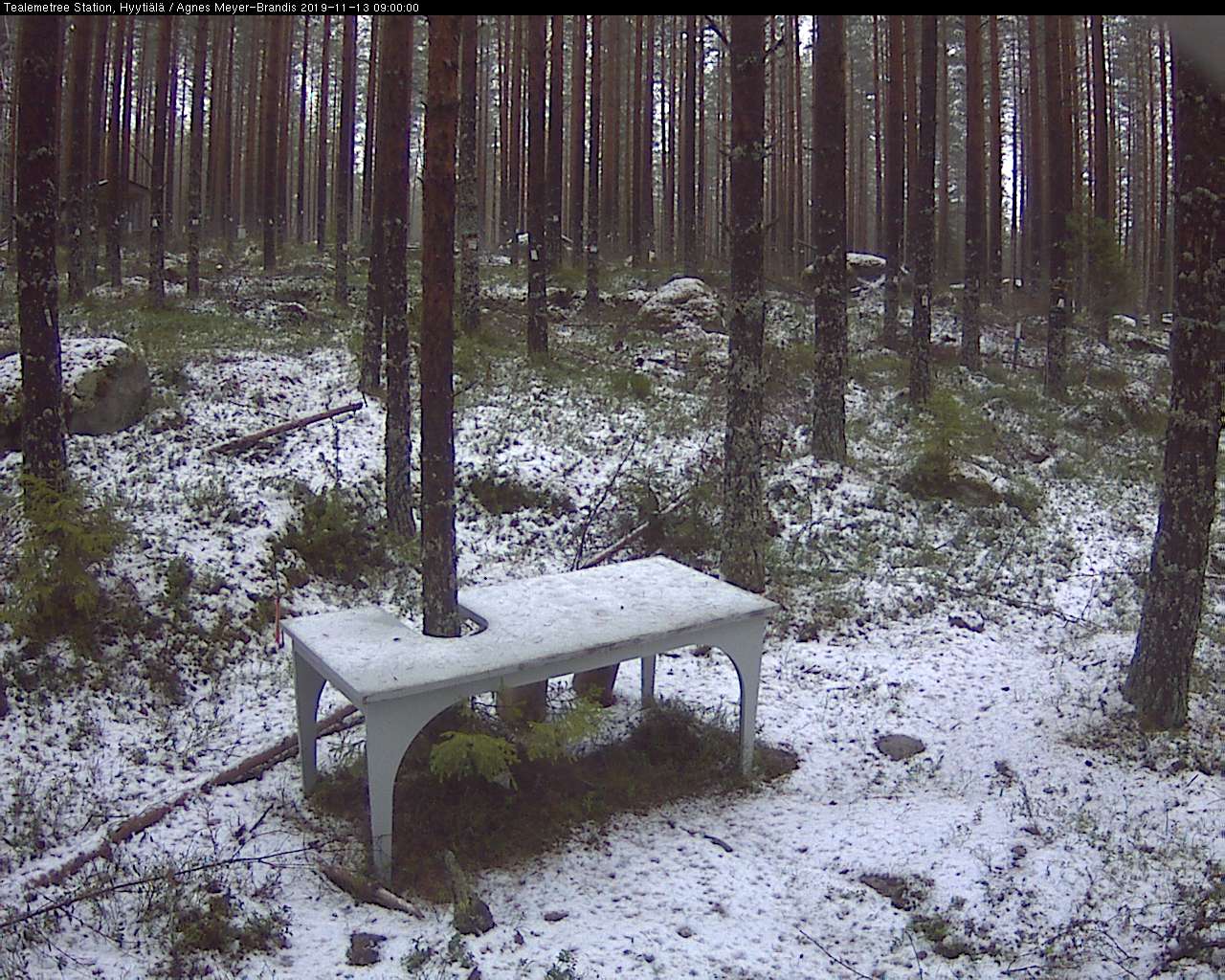 Agnes Meyer-Brandiksen työ Hyytiälässä alkoi tutustumalla aseman muihin tutkijoihin. Pystyäkseen tapaamaan ihmisiä metsässä, hän rakensi pöydän, josta muodostui kohtauspiste ja paikka teehetkille Agneksen ja puun kanssa.