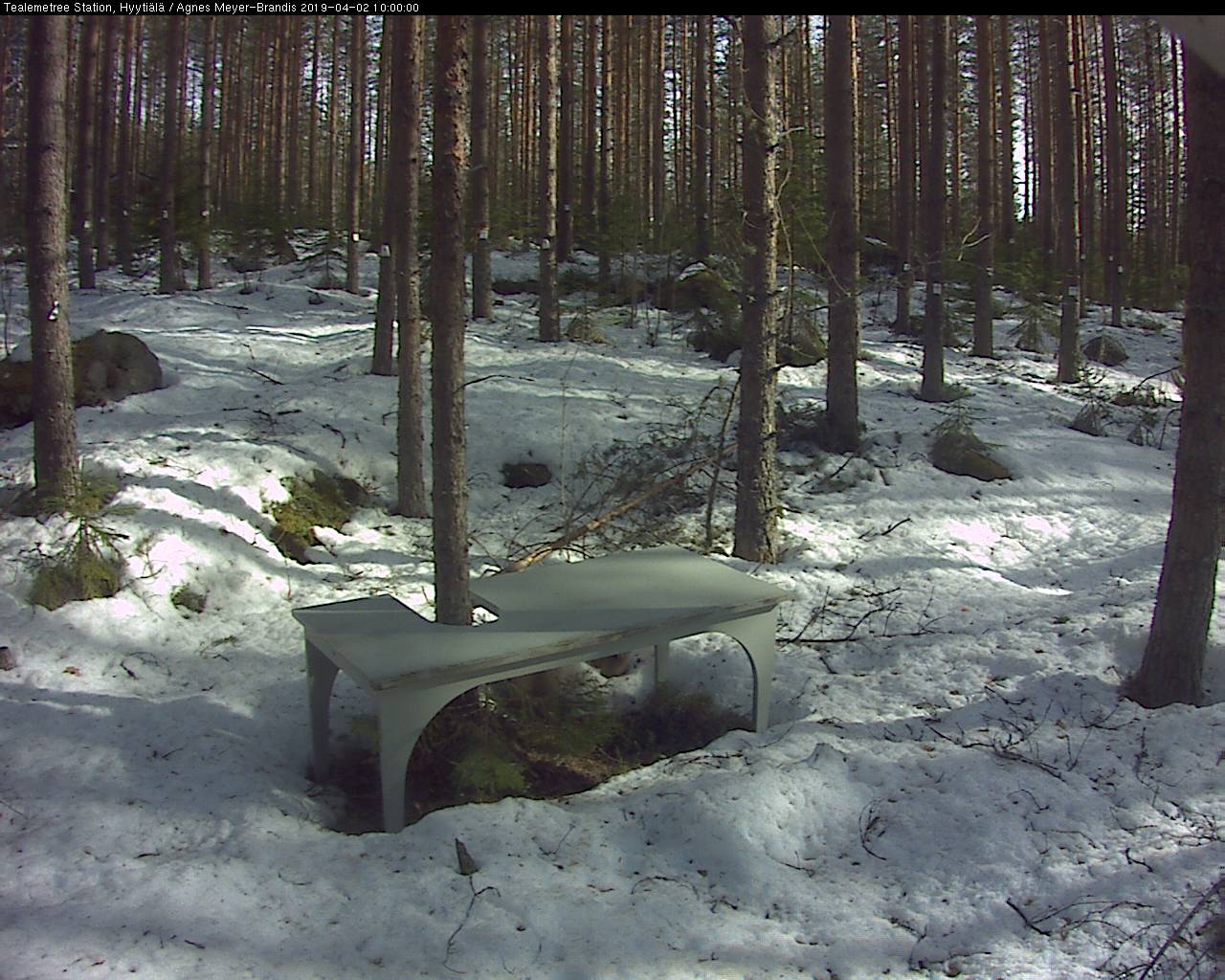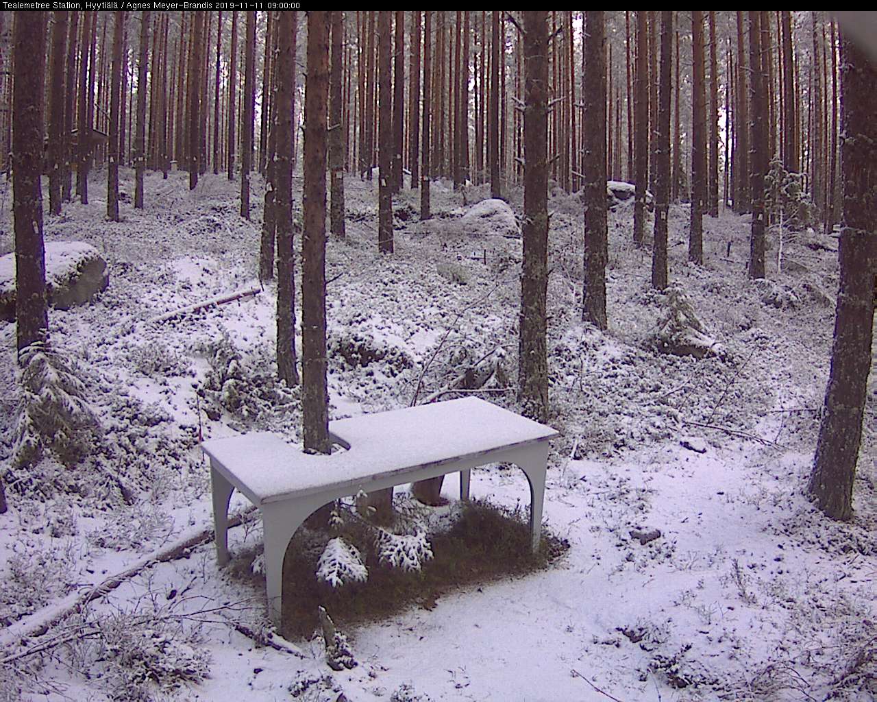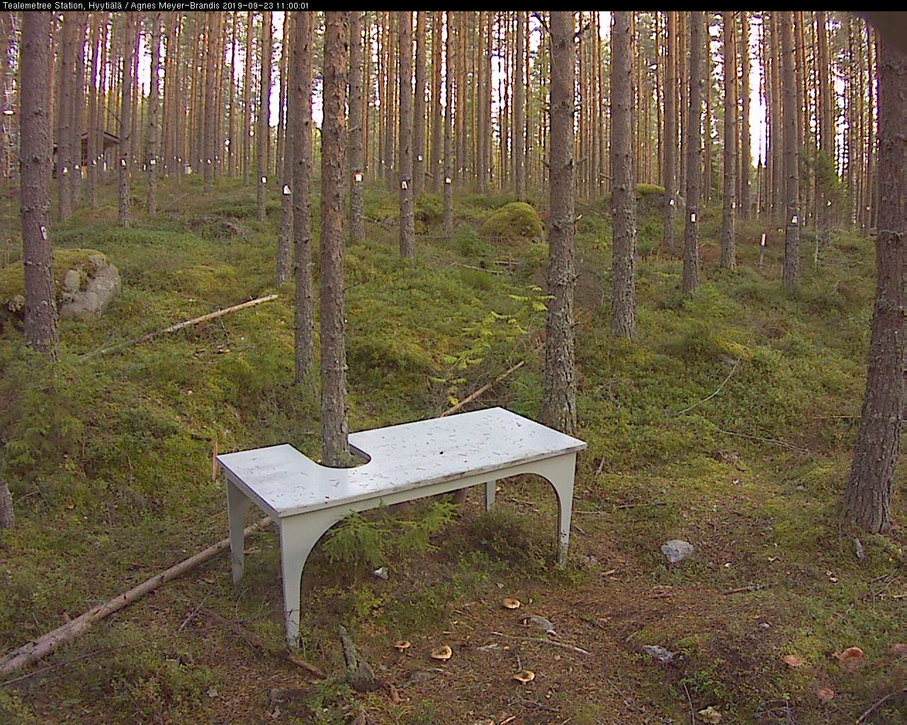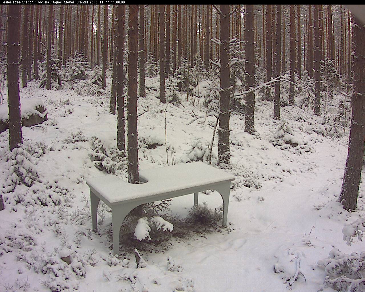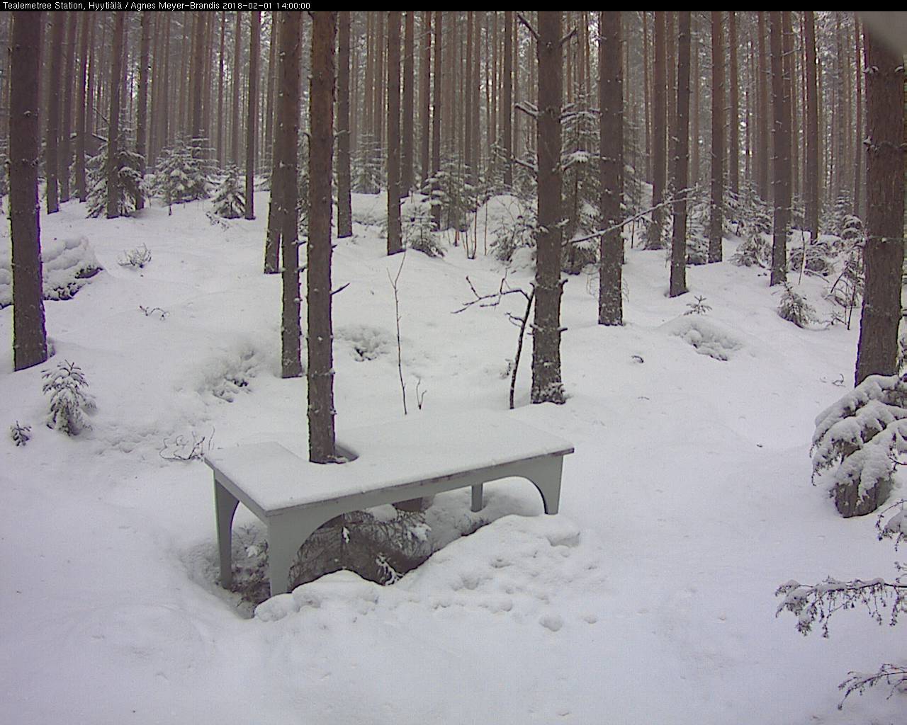 Agnes Meyer-Brandiksen työ Hyytiälässä alkoi tutustumalla aseman muihin tutkijoihin. Pystyäkseen tapaamaan ihmisiä metsässä, hän rakensi pöydän, josta muodostui kohtauspiste ja paikka teehetkille Agneksen ja puun kanssa.