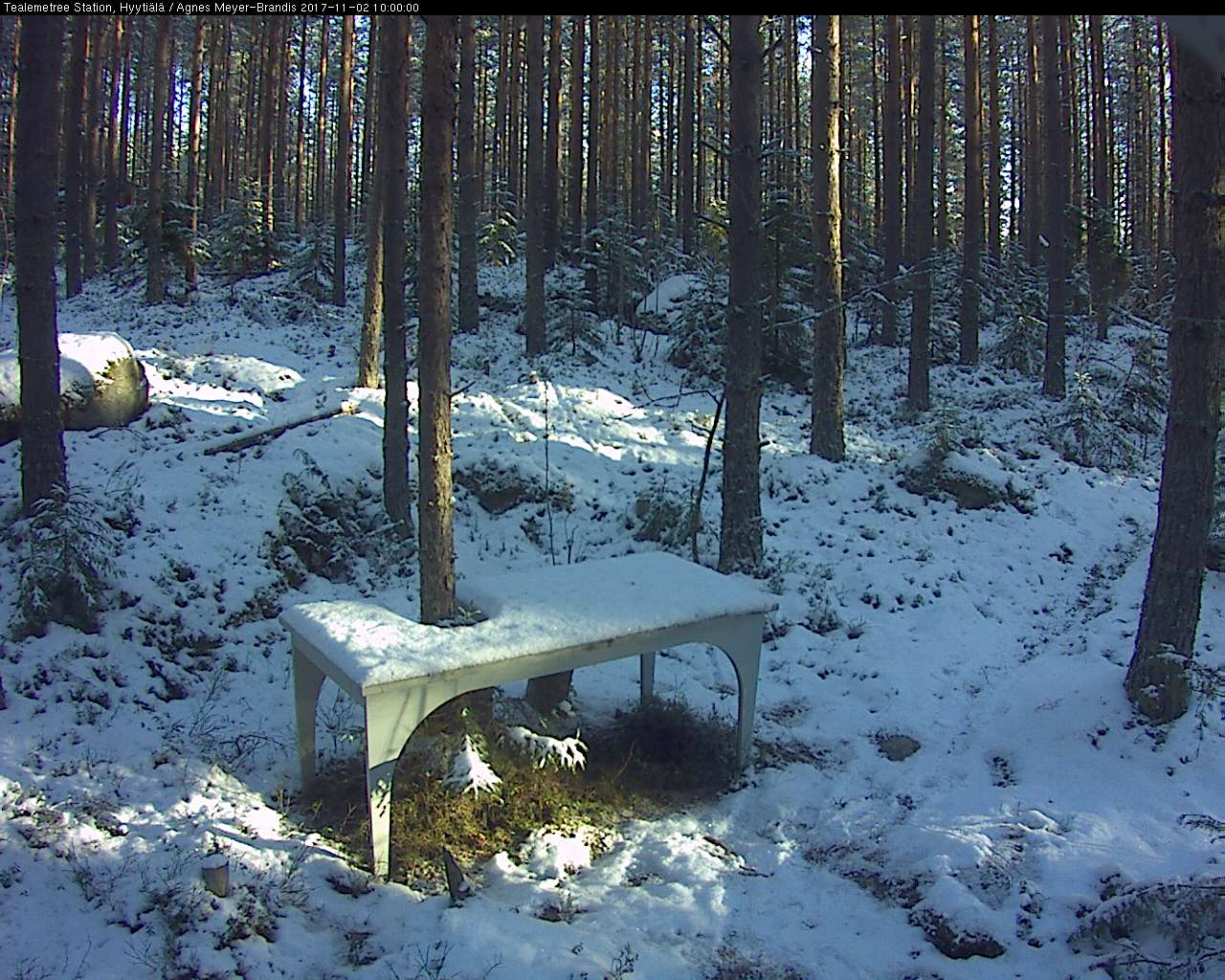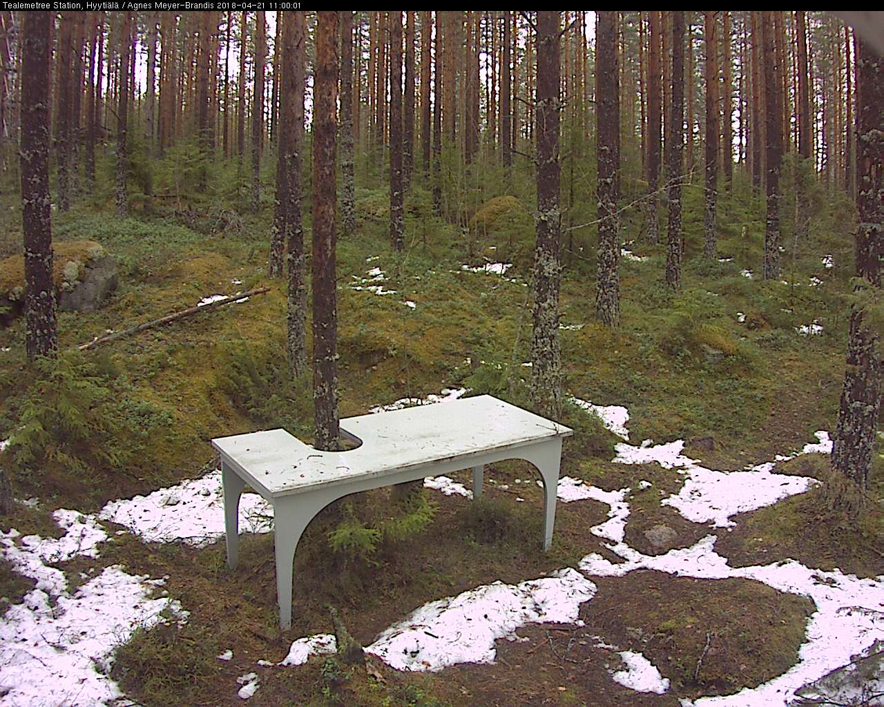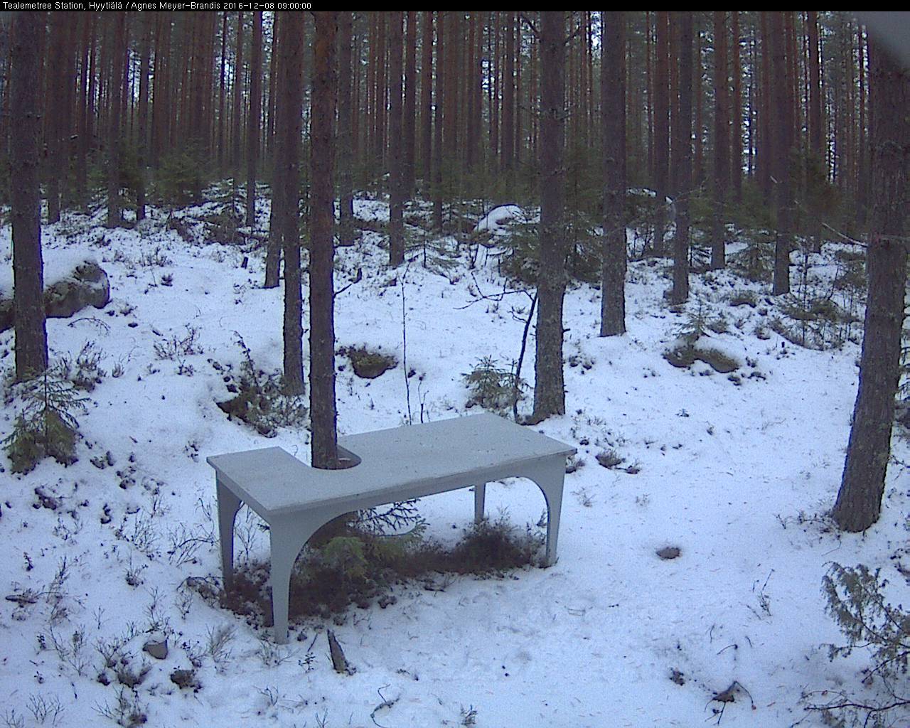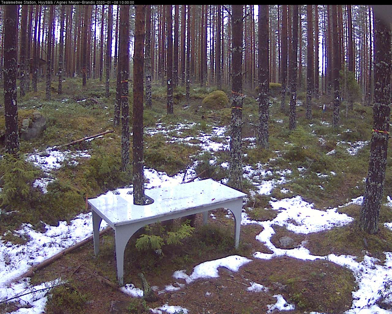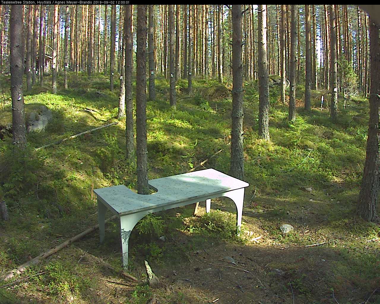 Agnes Meyer-Brandiksen työ Hyytiälässä alkoi tutustumalla aseman muihin tutkijoihin. Pystyäkseen tapaamaan ihmisiä metsässä, hän rakensi pöydän, josta muodostui kohtauspiste ja paikka teehetkille Agneksen ja puun kanssa.