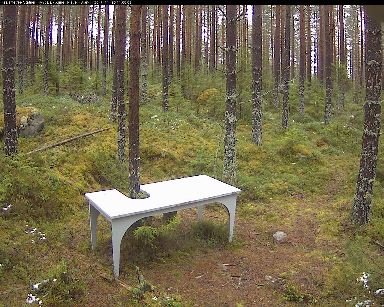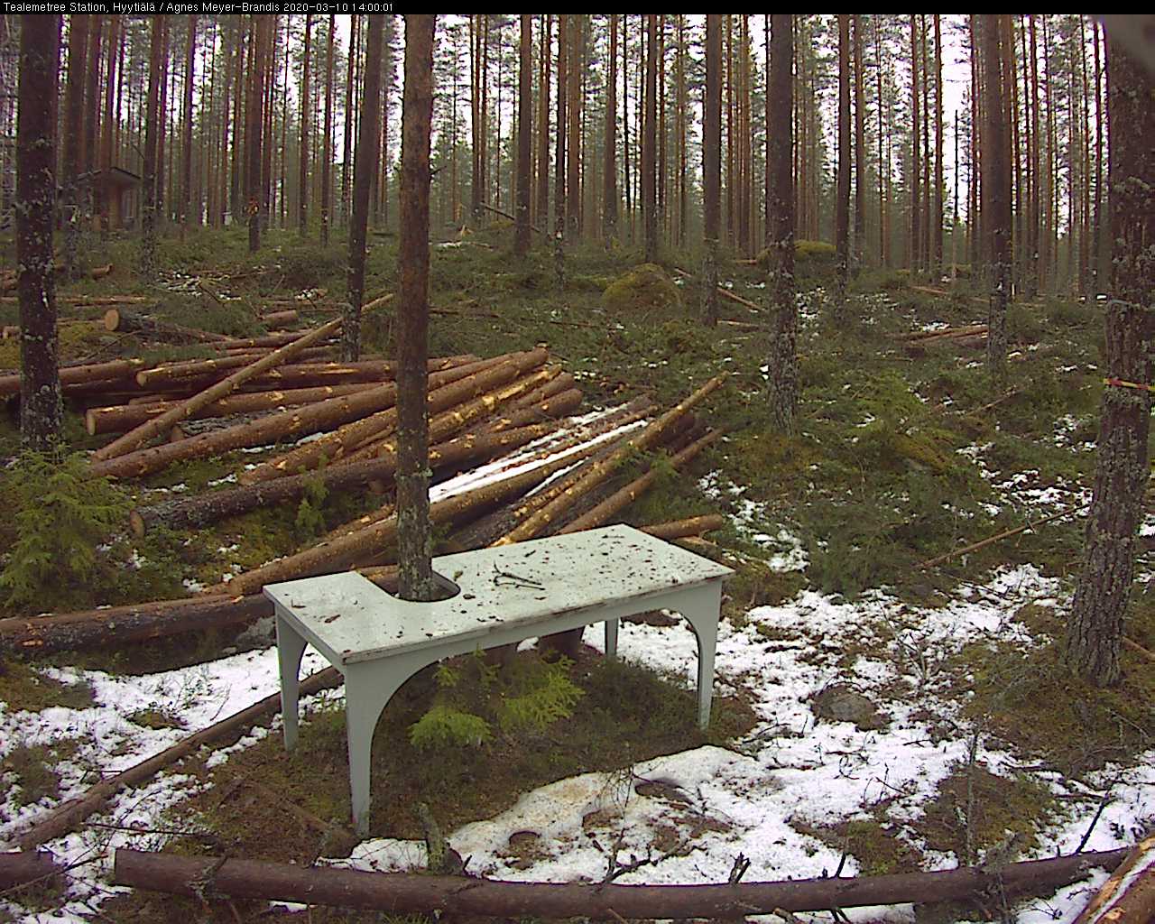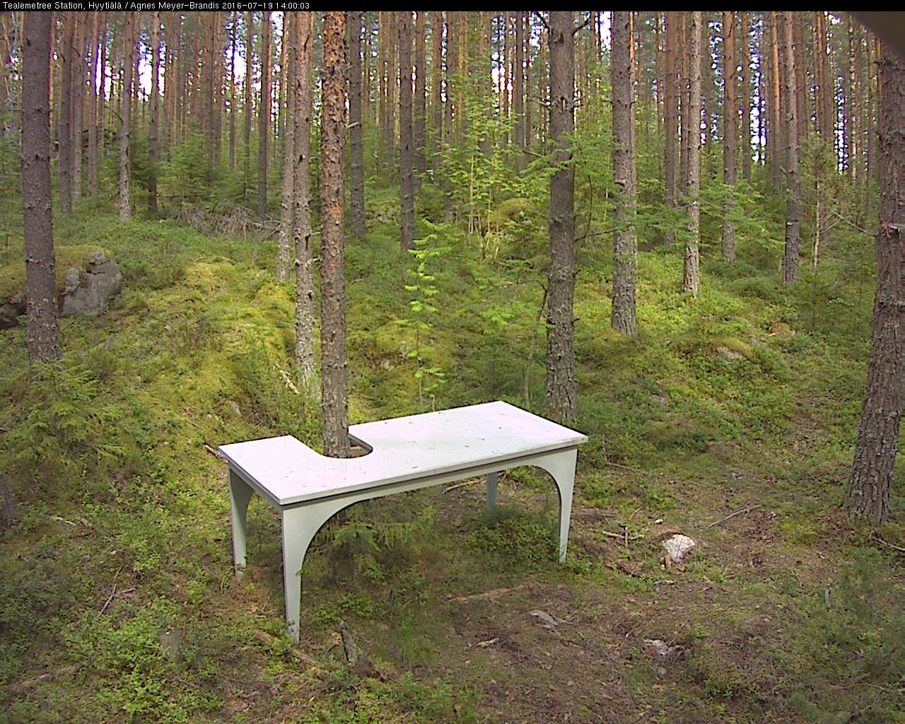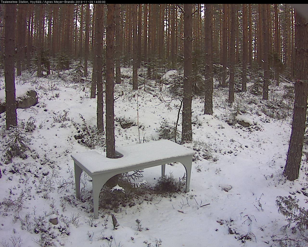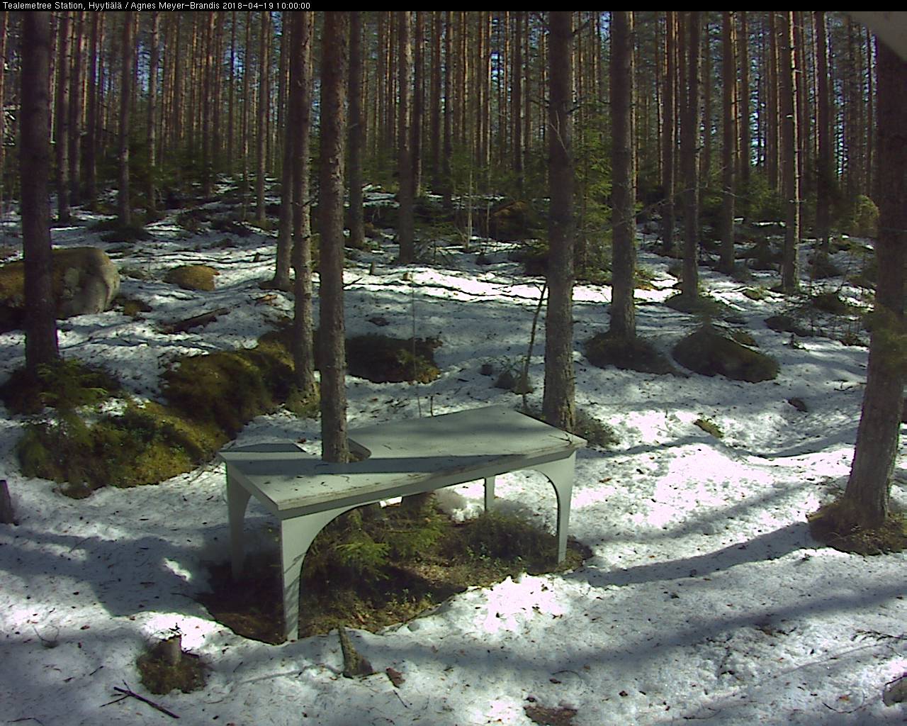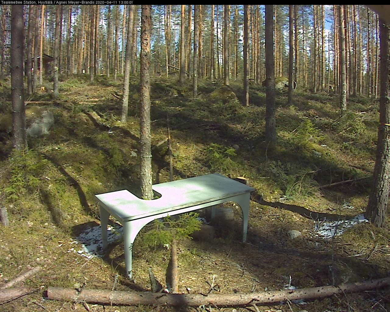 Agnes Meyer-Brandiksen työ Hyytiälässä alkoi tutustumalla aseman muihin tutkijoihin. Pystyäkseen tapaamaan ihmisiä metsässä, hän rakensi pöydän, josta muodostui kohtauspiste ja paikka teehetkille Agneksen ja puun kanssa.