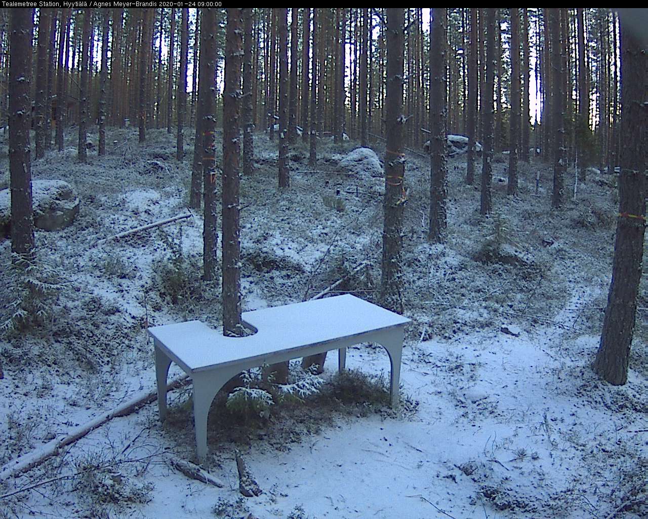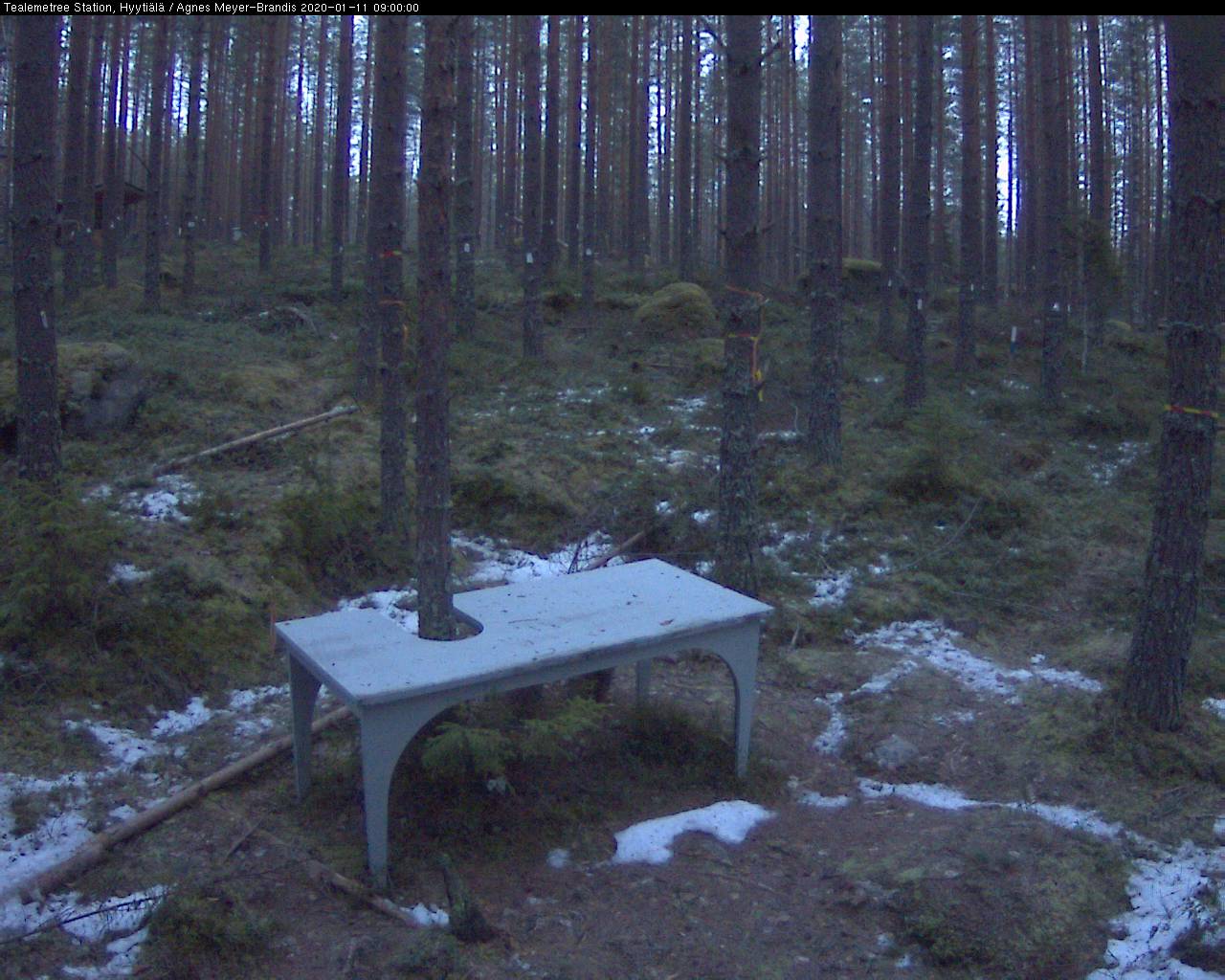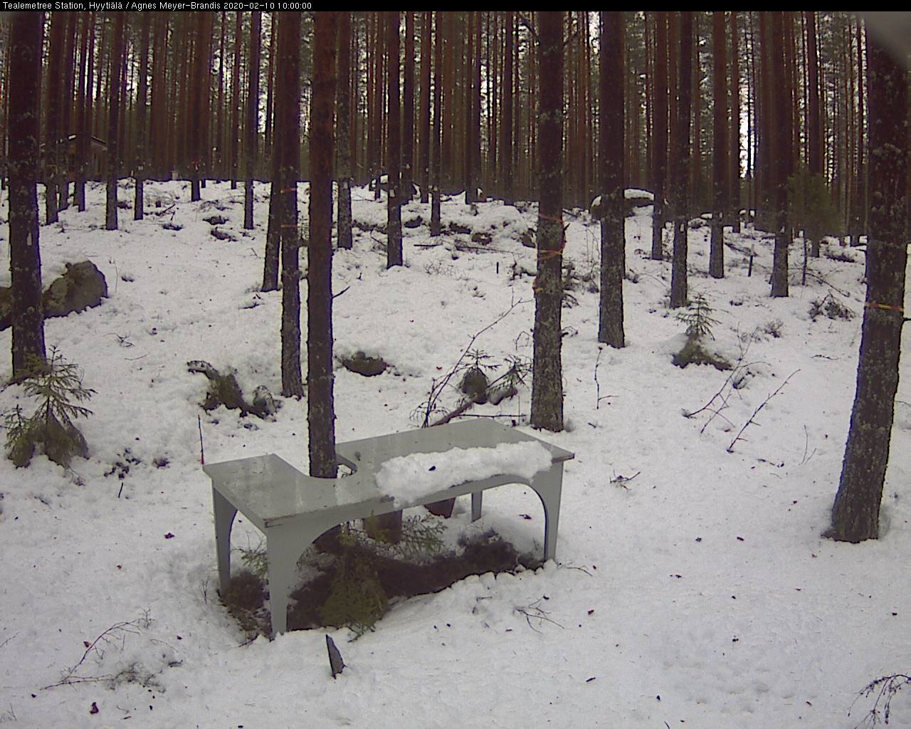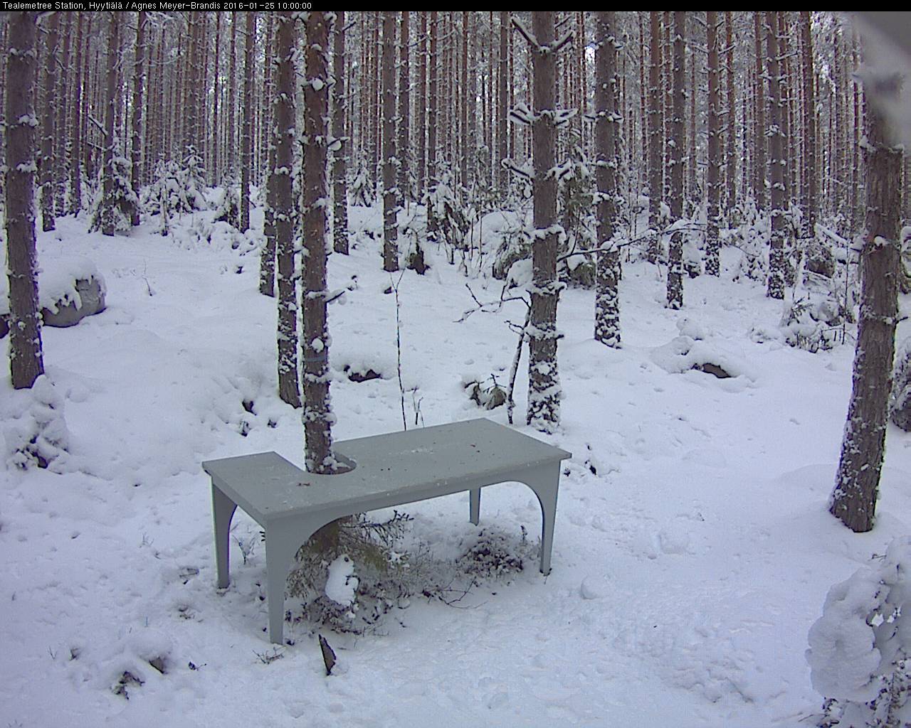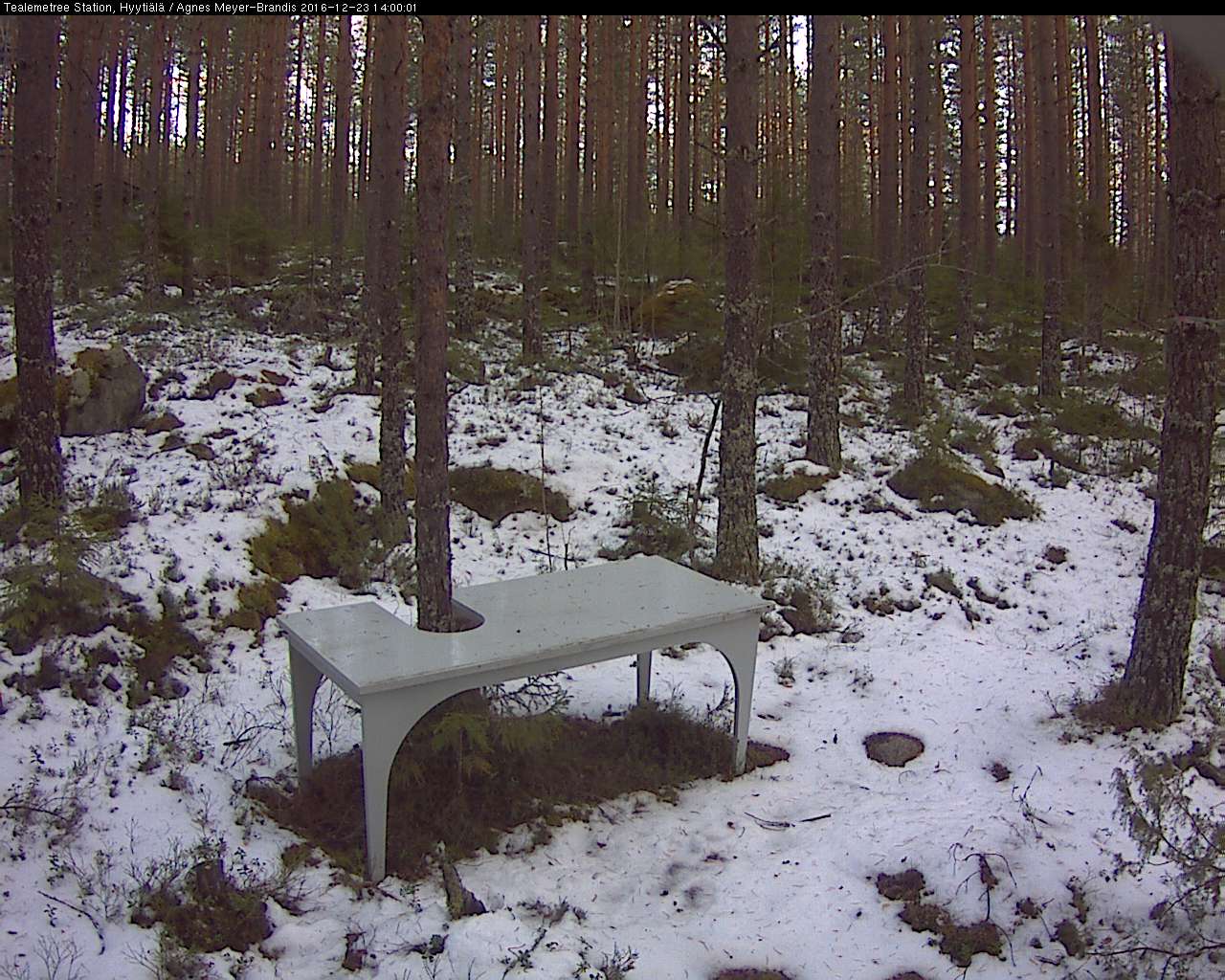 Agnes Meyer-Brandiksen työ Hyytiälässä alkoi tutustumalla aseman muihin tutkijoihin. Pystyäkseen tapaamaan ihmisiä metsässä, hän rakensi pöydän, josta muodostui kohtauspiste ja paikka teehetkille Agneksen ja puun kanssa.